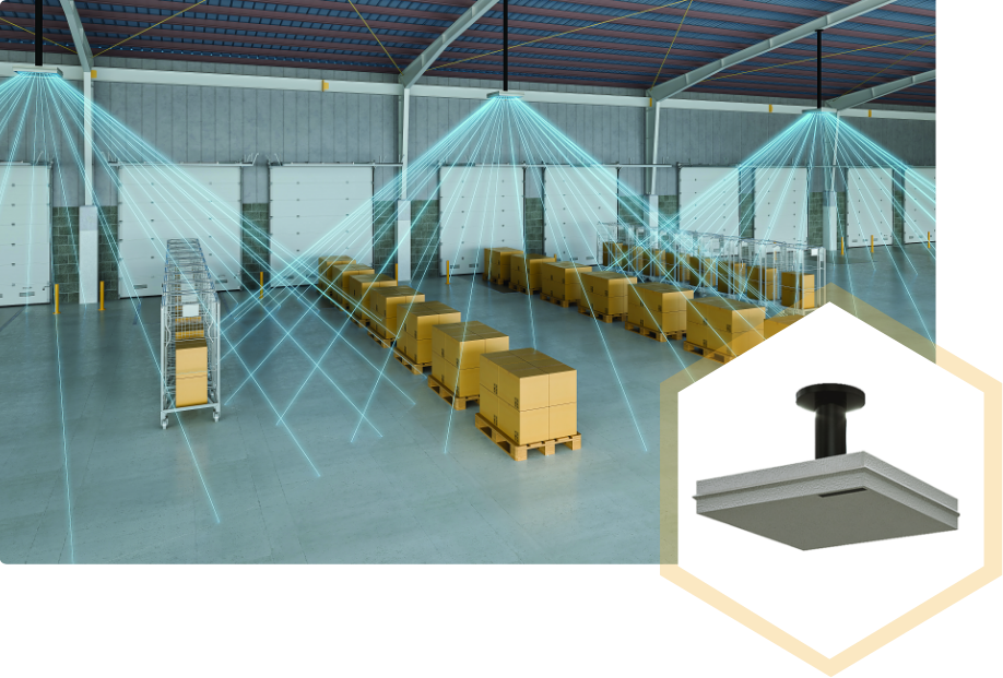 Continuous Scanning (CS) Smart Antenna technology is crucial to any passive Real-Time Location System (RTLS). Offering an impressive location accuracy of 30 cm (1 ft), our smart antennas are ideal for high ceilings and wide areas, e.g. dock doors, aisles and racking, or production and staging lines.